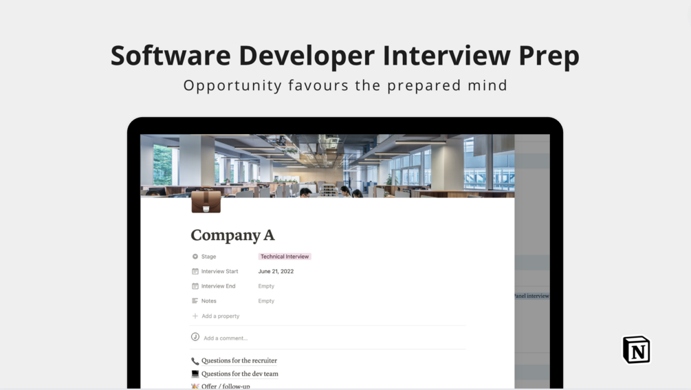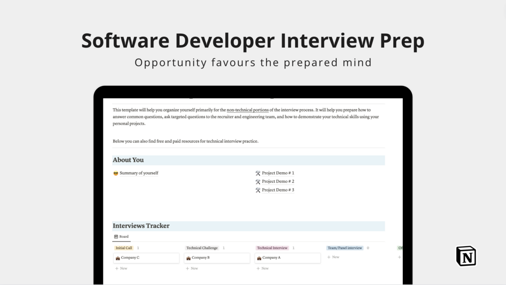 This Notion template will help you organize yourself primarily for the non-technical portions of the interview process. It will help you prepare: